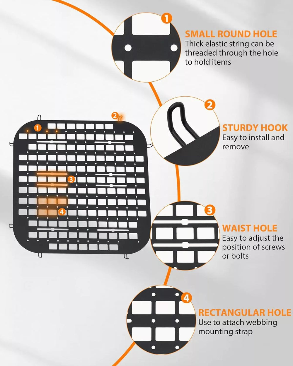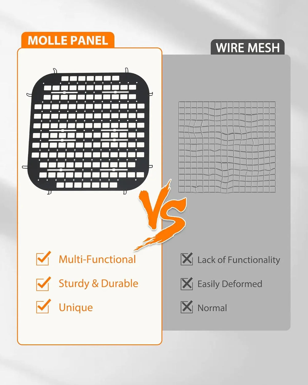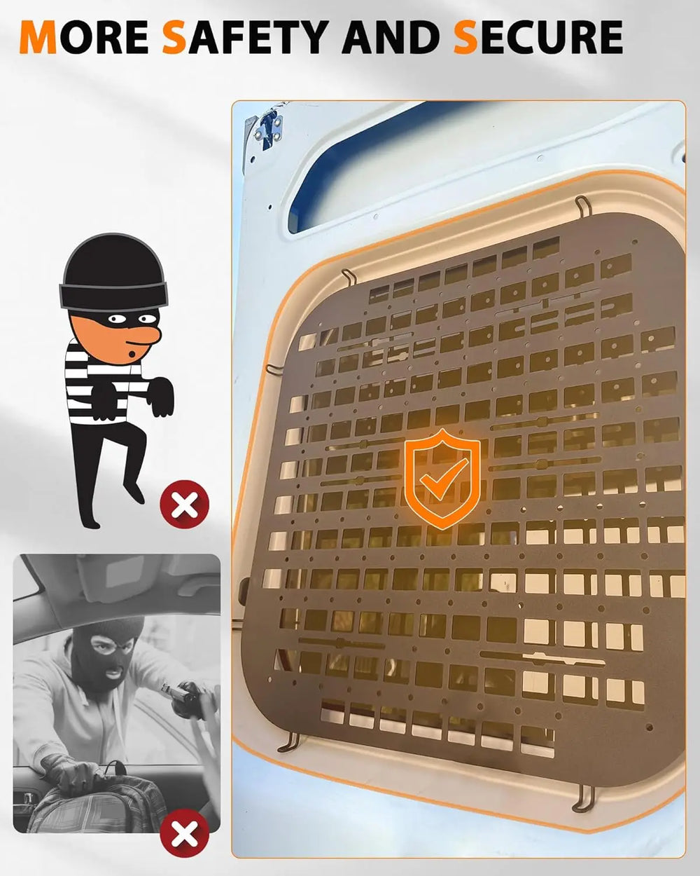 Versatile and Customizable: The MOLLE system allows for full customization, so you can tailor the security window screen to fit your specific needs. Whether you're mounting a first-aid kit, fire extinguisher, or any other essential gear, the panel adapts to your unique requirements, providing both security and convenience.