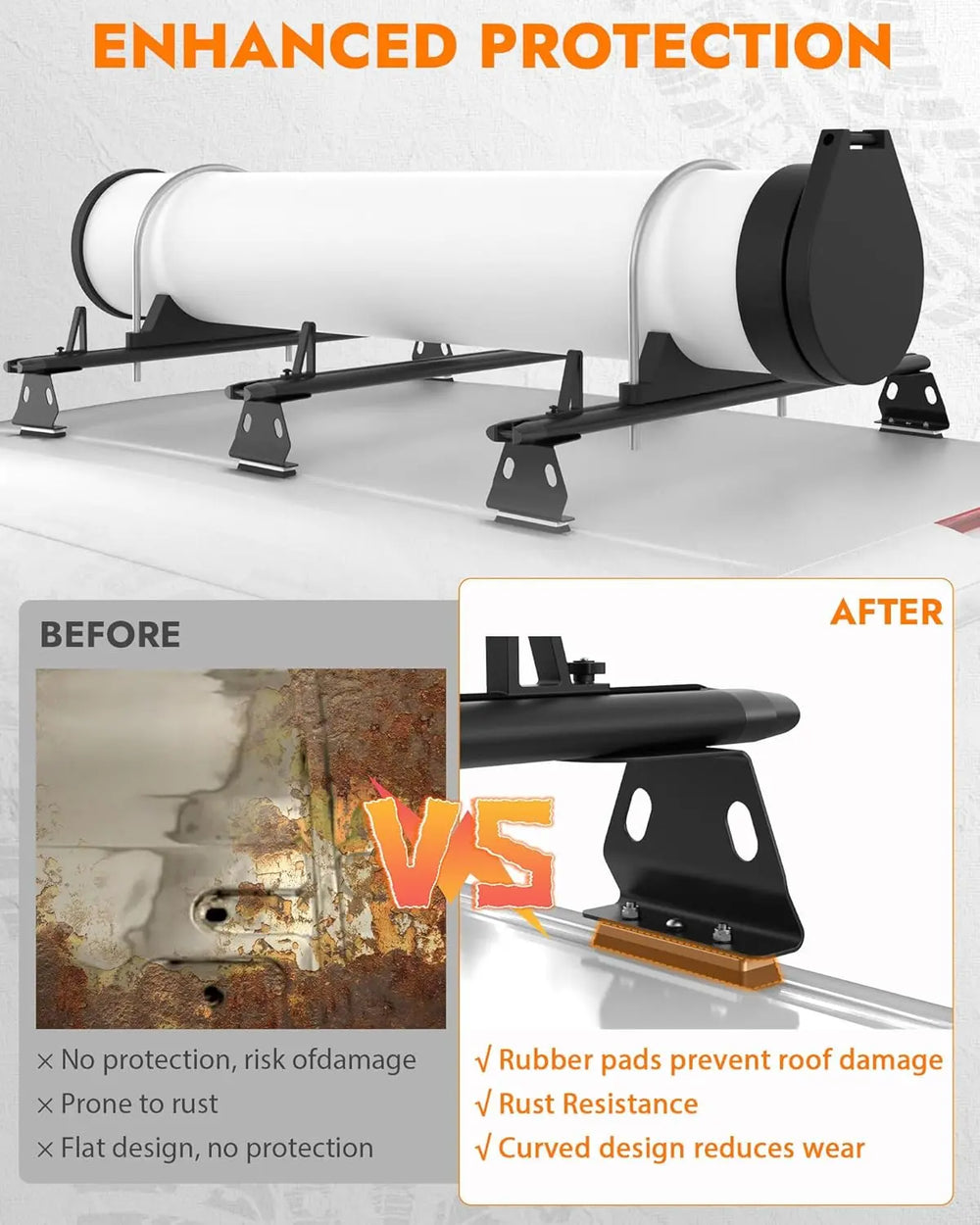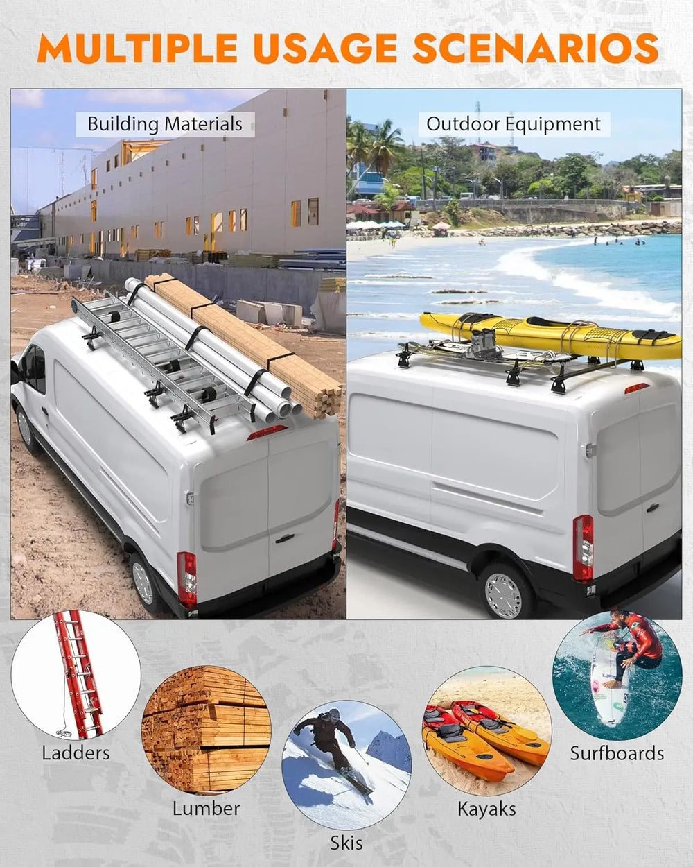 T-SLOT DESIGN FOR EASY EXPANSION:This aluminum van roof rack features an integrated T-slot roof rack design that gives you the freedom to carry more, with less hassle. From weekend kayak trips and bike adventures to securing ladders and long materials on the job, accessories mount quickly and stay firmly in place. The T-slots work seamlessly with the crossbars, turning your cargo van roof rack system into a reliable, space-saving solution that makes every trip feel easier and more efficient.