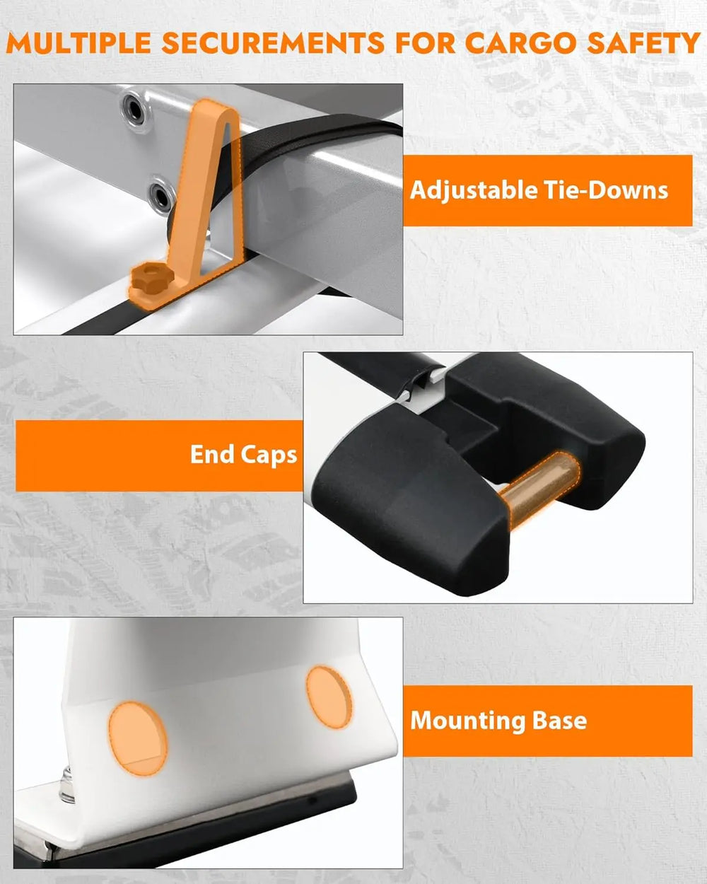 STABLE & SECURE:End cap, adjustable tie-downs and holes on mounting base of van racks provide different fixation points, can fasten items firmly to ensure safety and stability while transportation.