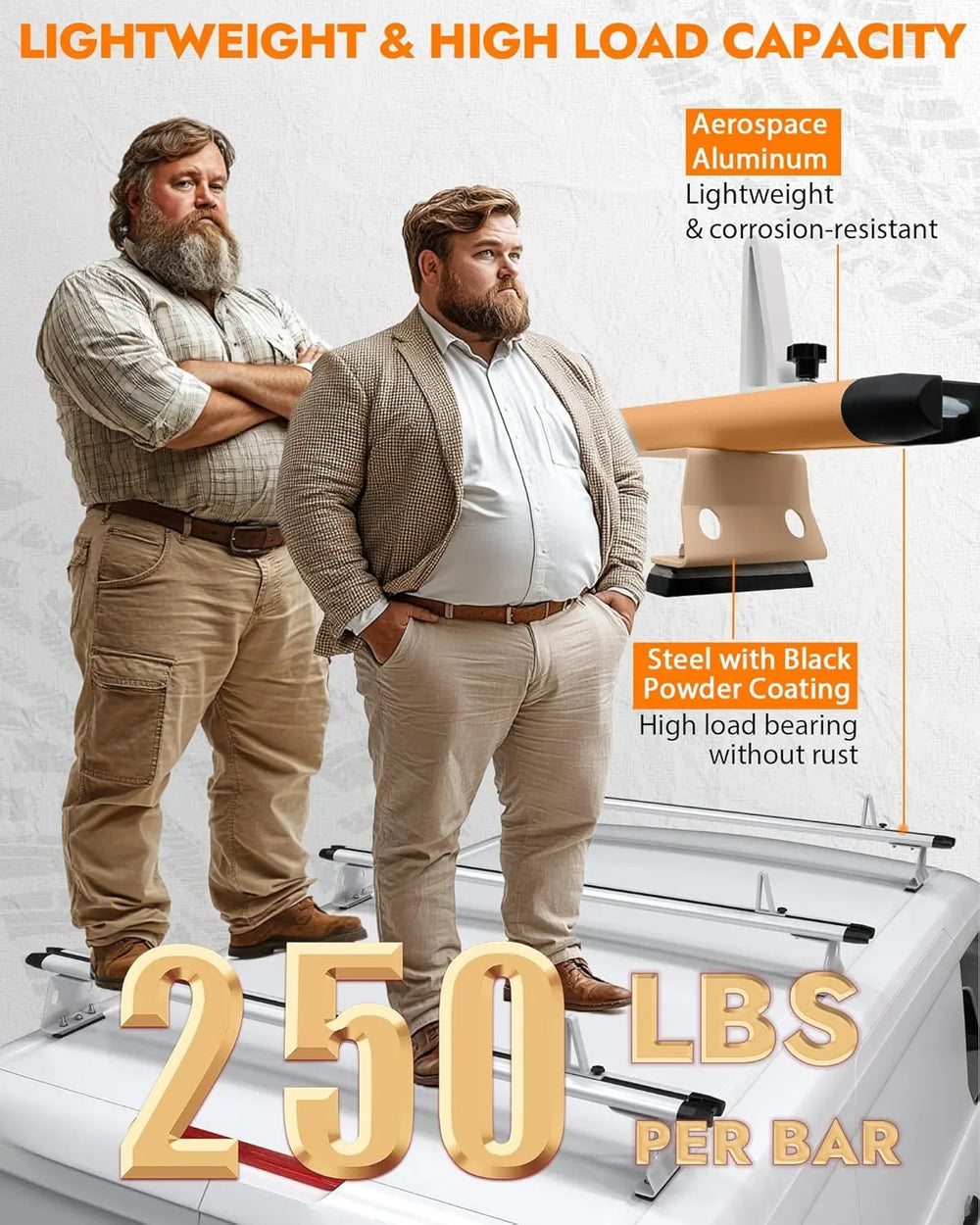 T-SLOT DESIGN FOR EASY EXPANSION:This aluminum van roof rack features an integrated T-slot roof rack design that gives you the freedom to carry more, with less hassle. From weekend kayak trips and bike adventures to securing ladders and long materials on the job, accessories mount quickly and stay firmly in place. The T-slots work seamlessly with the crossbars, turning your cargo van roof rack system into a reliable, space-saving solution that makes every trip feel easier and more efficient.