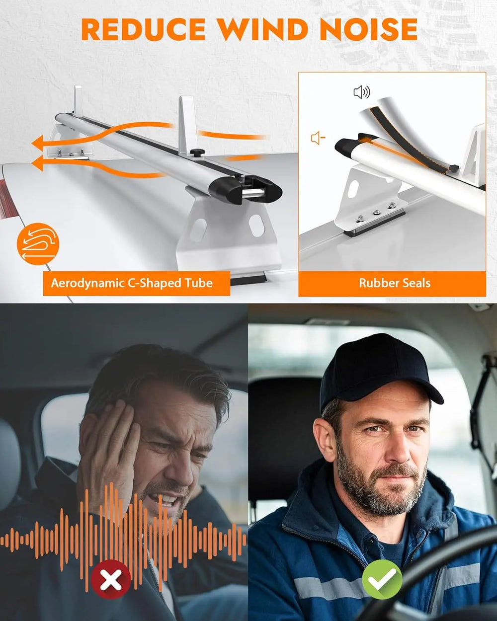WIND NOISE REDUCE:This aluminum van roof rack features clean, streamlined lines that closely follow the vehicle roof for a professional, low-profile look. The aerodynamic C-shaped crossbars improve stability and reduce drag at highway speeds. Also we provide rubber sealing strips that can be inserted into the crossbars’ upper and lower channel to reduce wind-noise effectively.
