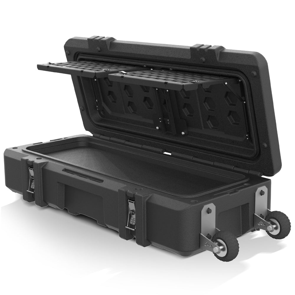 Versatile Accessory Design: The Cargo Case features an Outside Molle Panel, a Lay-Flat Built-In Molle Panel Tabletop, and an Inside Molle Panel, along with Travel Assist Tires. These elements optimize space both inside and outside the case, allowing for the addition of various accessories. The Travel Assist Tires enhance your convenience while traveling.