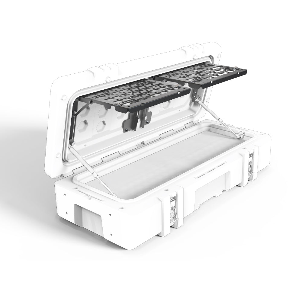 The MELIPRON MGS Lay-Flat Built-In MOLLE Panel fits inside your 141 Quart Waterproof Cargo Case, offering both organized storage and a flat workspace. This versatile accessory helps you securely store small items while also doubling as a tabletop for outdoor activities.