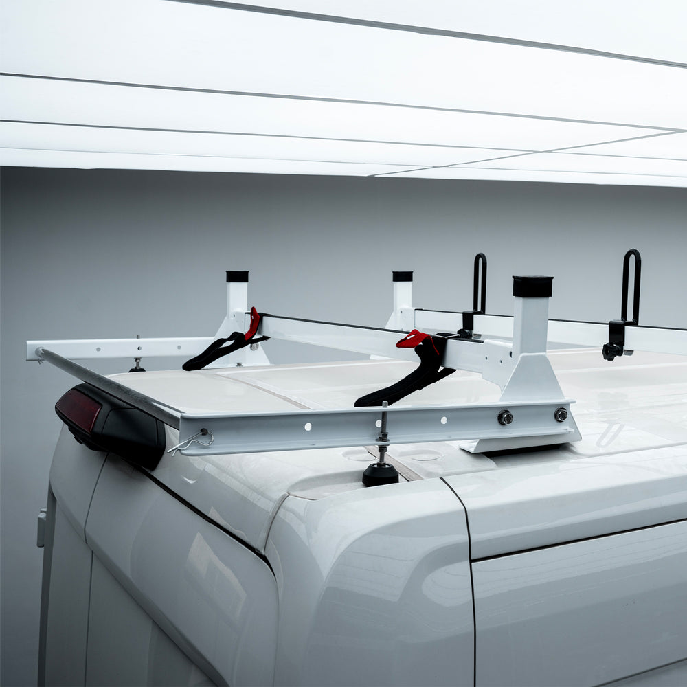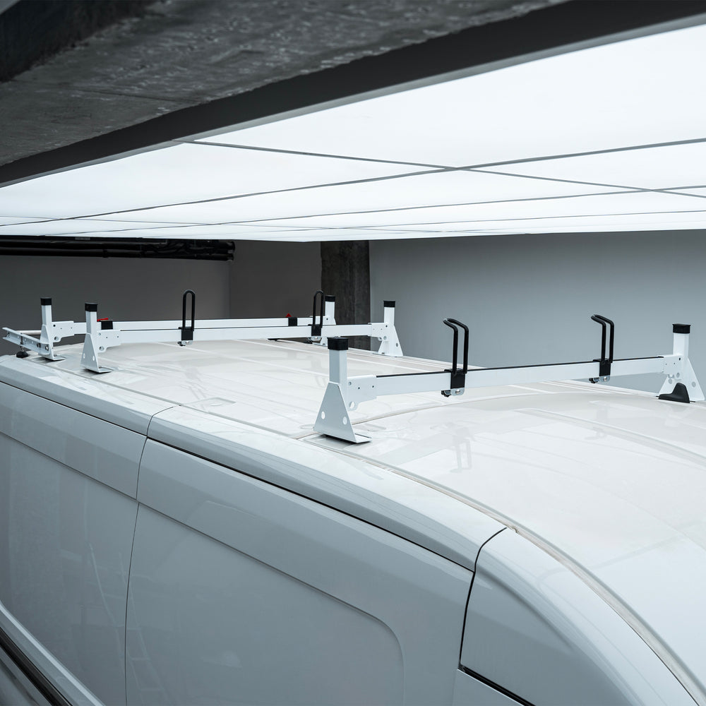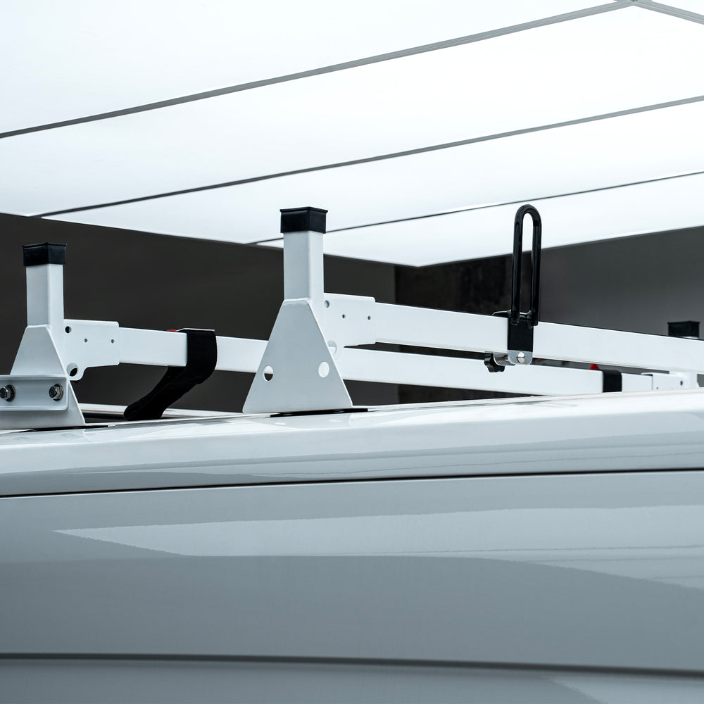 Built to Last: Transit rack is crafted from heavy-duty alloy steel with white powder-coated finish , durable and sturdy, anti-rust and anti-corrosion. The non-scratch design ensures that your van's roof remains pristine, even after years of use