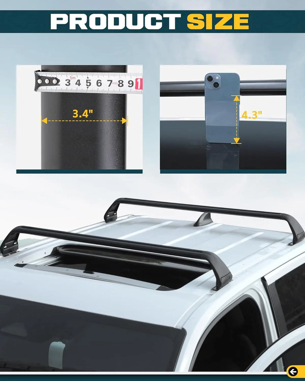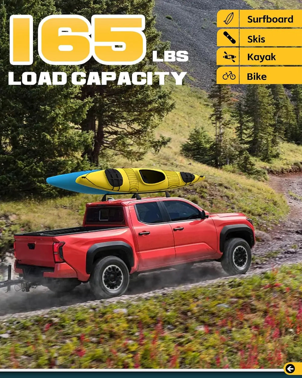 165 LBS LOAD CAPACITY: Supports a maximum load capacity of up to 165 lbs (75 kg) when evenly distributed. Perfect for carrying kayaks, canoes, snowboards, bikes, luggage, fishing poles, cargo boxes, and more—providing ample space for all your adventure gear.