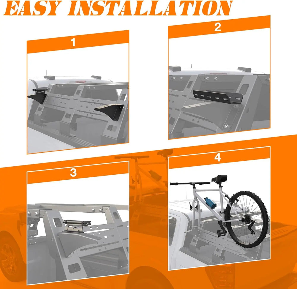 - WIDE APPLICATION: Truck bed bike rack is compatible with full-size pickup trucks, such as Ford F150, 250,350, Dodge Ram, Chevy Silverado, GMC Sierra, etc, as long as your truck bed has an overland bed rack. Attention, our bike rack uses M8 bolts to install to the bed rack.