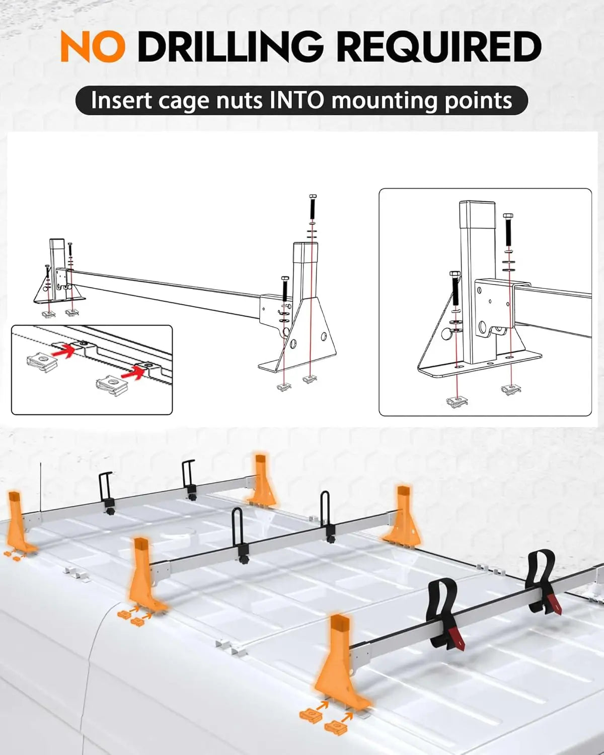 800 LBS Load Capacity: This cargo van roof rack is ideal for commercial use, with each bar supporting an evenly distributed load capacity of 250 pounds. It accommodates pipes, ladders, tubes, and other bulky items effortlessly.